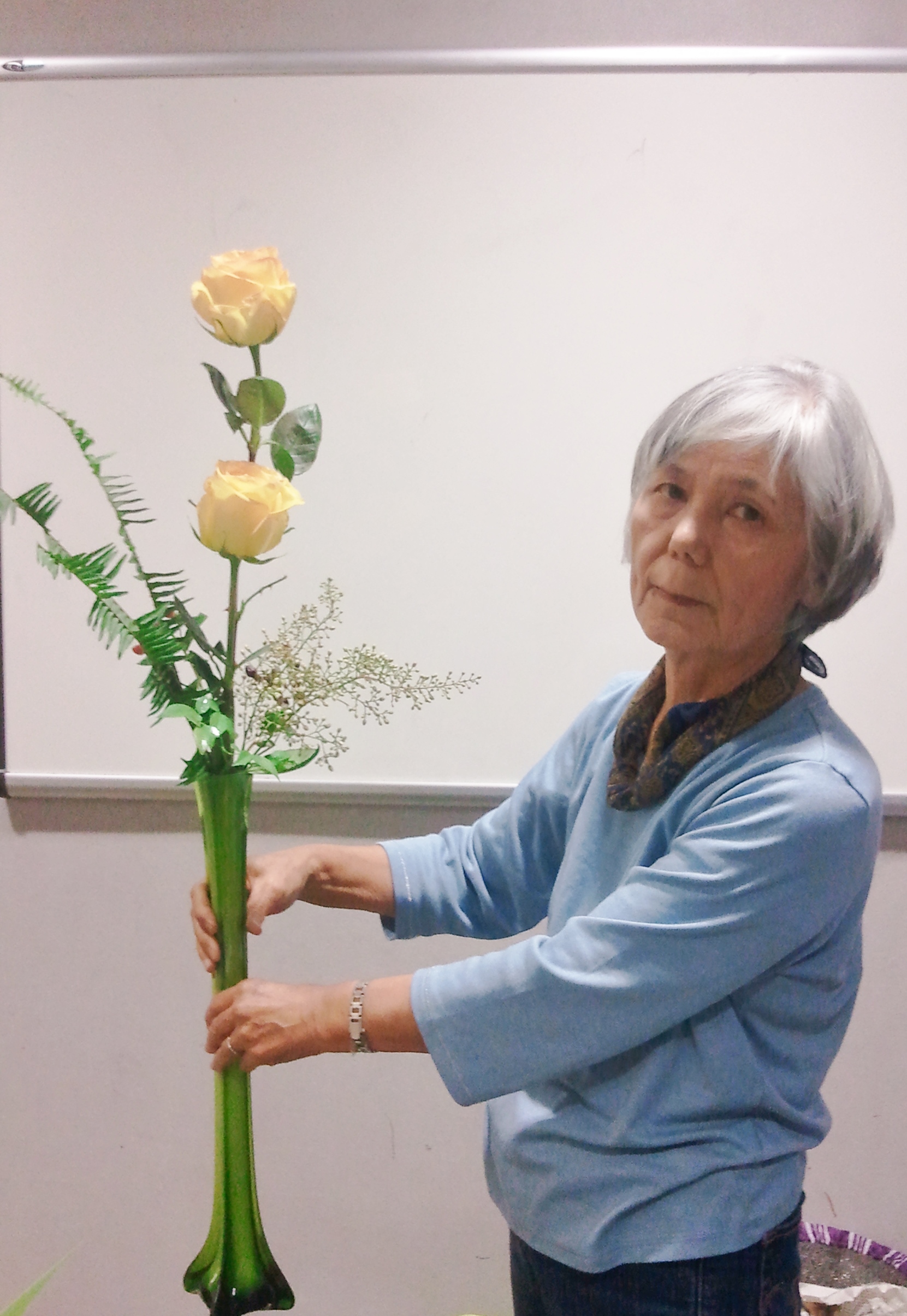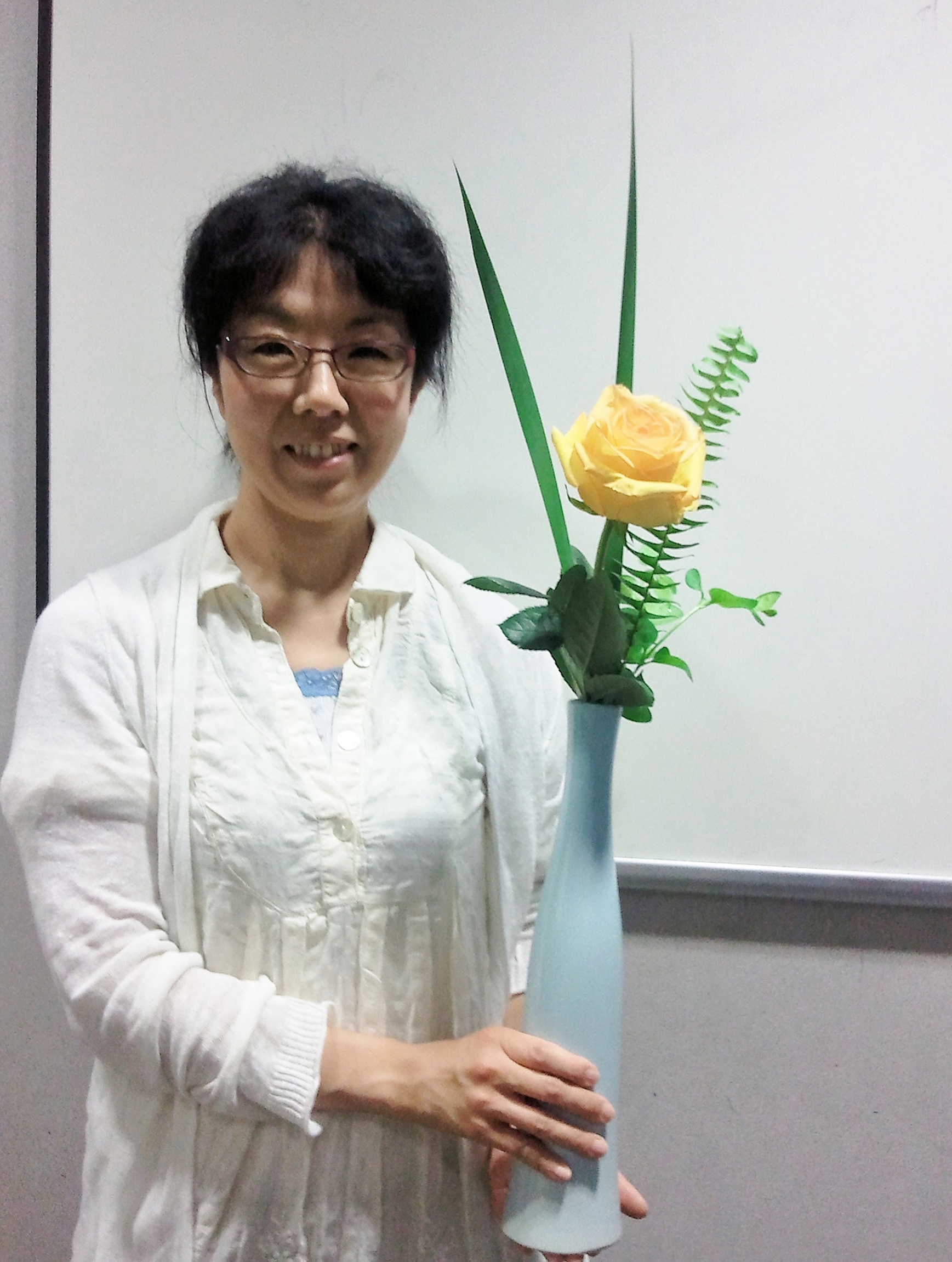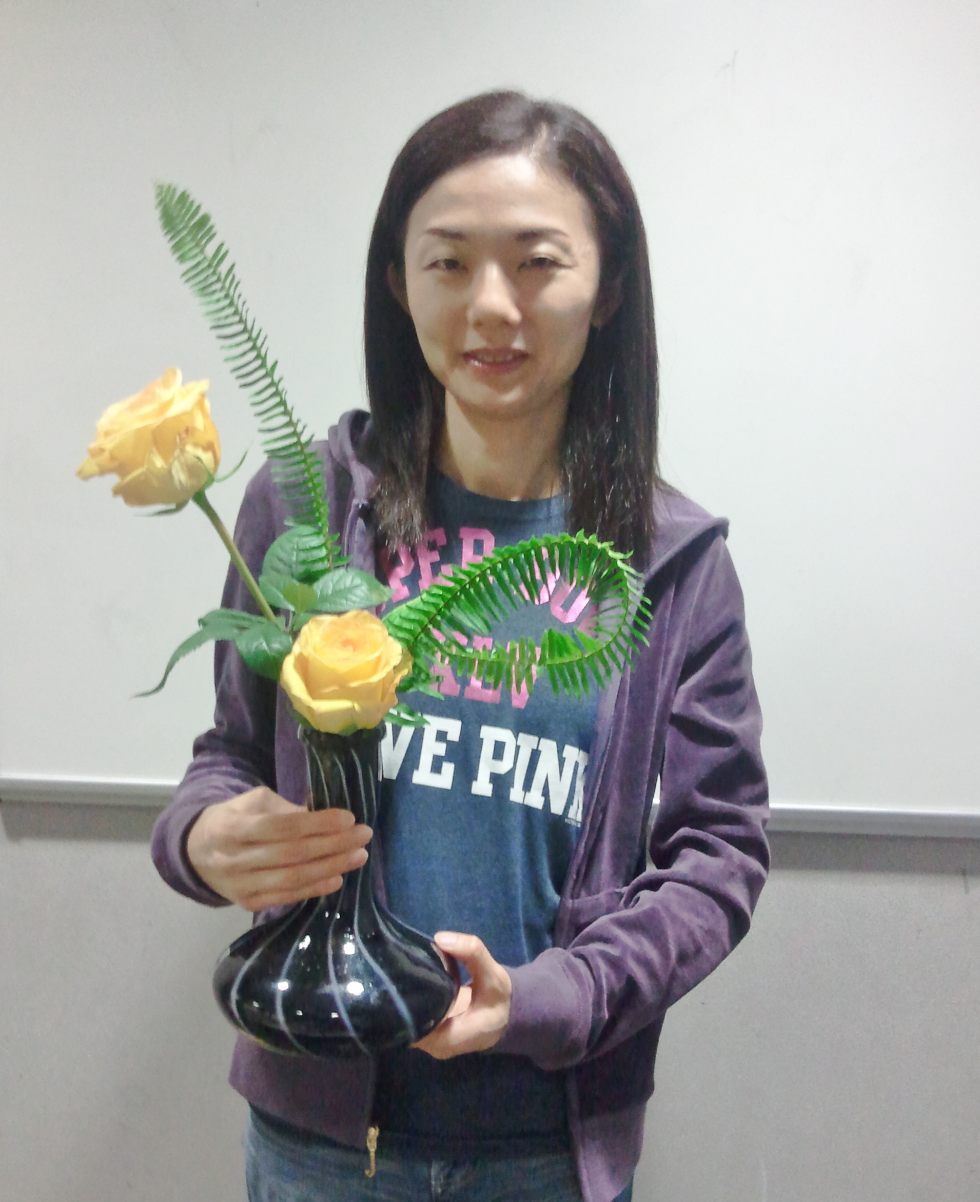 The lesson was taught by Eiko Miura Sensei. She is an excellent experienced teacher. It was like a dream where I could do Ikebana with people whose culture and background were different.. We share love and passion toward Ikebana. I am so confident that I can make my Ikebana skill use even outside of Japan.