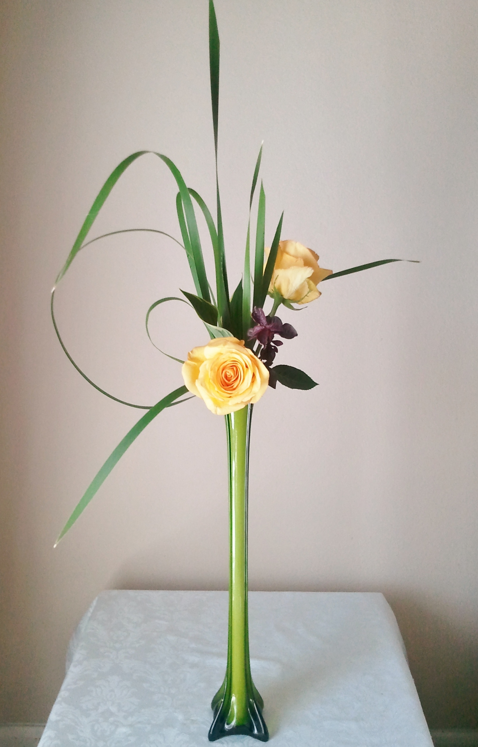 We used very beautiful yellow roses. The roses were perfectly beaitufil whose beauty didn’t need any othe flowers for me. I tried to express the beauty of yellow roses at the best so I only used two roses and greens and little accent of red and perple just as spice.